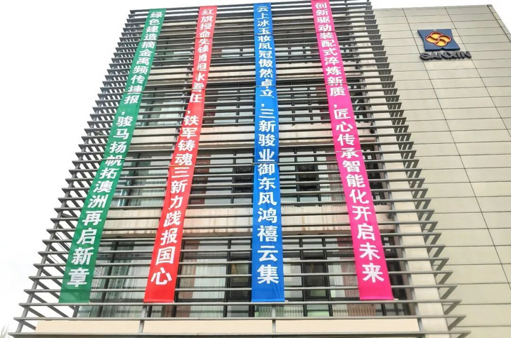 辦公大樓開(kāi)放式幕墻上垂掛的巨幅對(duì)聯(lián)格外醒目,似一面面仿古戰(zhàn)旗,威儀赫赫,獵獵飄揚(yáng),字里行間寫(xiě)出了三新2025年的宏大敘事和卓越不凡。旌旗林列,如盛唐儀仗般鋪展開(kāi)2025年的奮斗長(zhǎng)卷,將“創(chuàng)新引領(lǐng),打造新質(zhì)競(jìng)爭(zhēng)力”的主旋律,鐫刻進(jìn)每一寸躍動(dòng)的光影與滾燙的初心之中。全體三新人歡聚一堂,以旗為證,同憶崢嶸,共赴新程。旌旗引歲,年志昭彰。